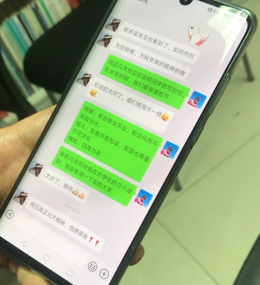 (張海霞在師生聯絡群中,發表了一段話:做事:專業敬業樂業,職業化而不是政治化;做人:友善開放包容,愛國也尊重不同文化;橫批:四海為家 崔澤昊/攝)