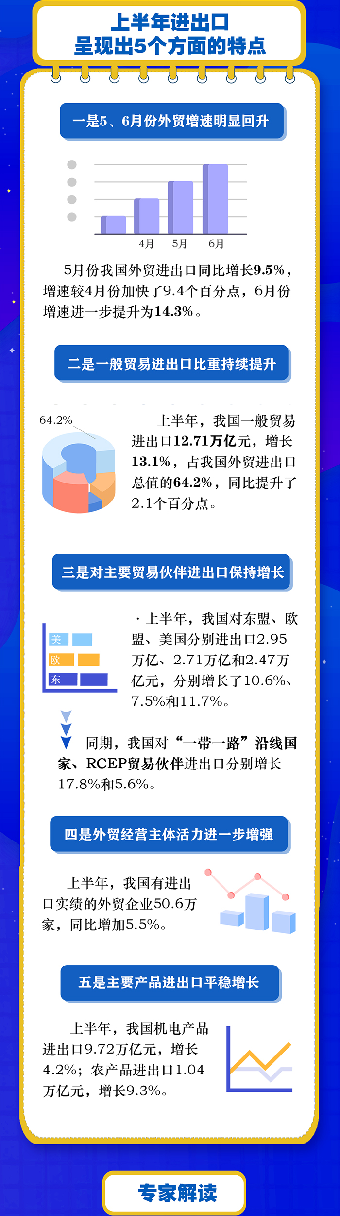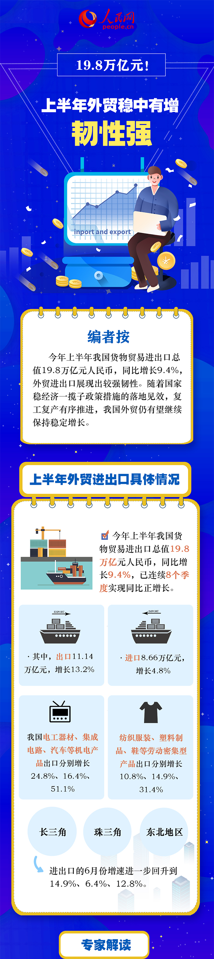 上半年我國外貿進出口展現出較強的韌性,一季度平穩開局,5、6月份迅速扭轉了4月份增速下滑的趨勢,為全年外貿保穩提質打下了堅實的基礎。據海關統計,今年上半年我國貨物貿易進出口總值19.8萬億元人民幣,同比增長9.4%。其中,出口11.14萬億元,增長13.2%;進口8.66萬億元,增長4.8%。