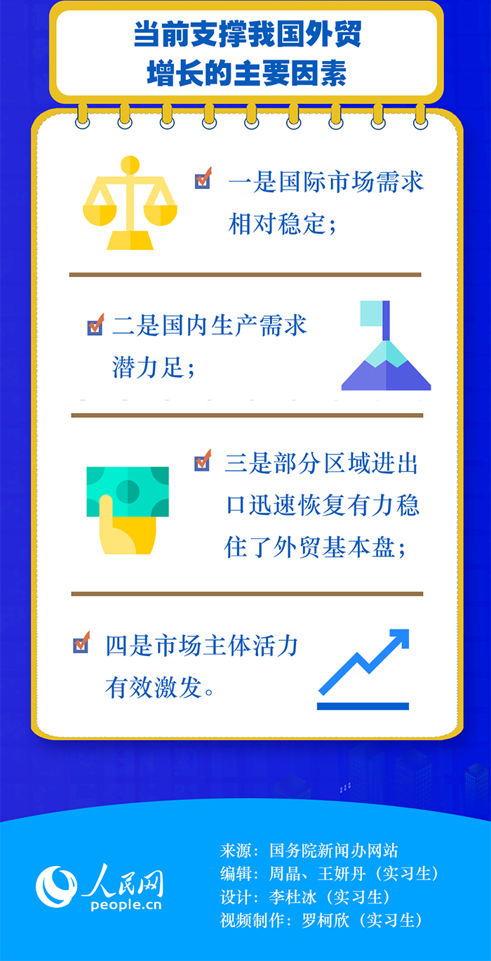 商務部原副部長魏建國在接受人民網“強觀察”欄目記者采訪時表示,上半年的外貿增長主要有三方面原因:首先,高效統籌疫情防控和經濟社會發展取得實效。其次,多措并舉穩市場主體。隨著國家穩經濟一攬子政策措施的落地見效,外貿保穩提質等各項工作加快推進,我國外貿市場主體活力有效激發。此外,以國內大循環為主體、國內國際雙循環相互促進的新發展格局的作用正在發揮出來。